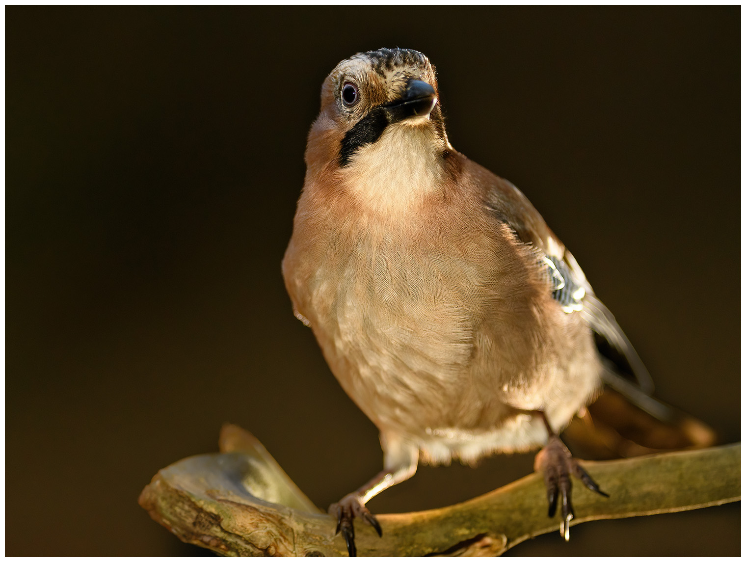 Nötskrika fotograferad med hjälp av artificiellt ljus tidigt på morgonen.