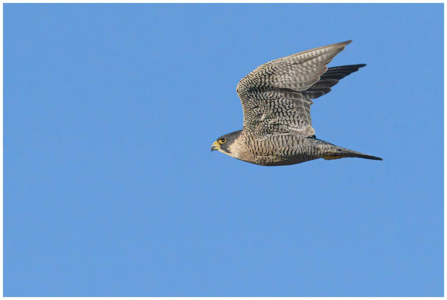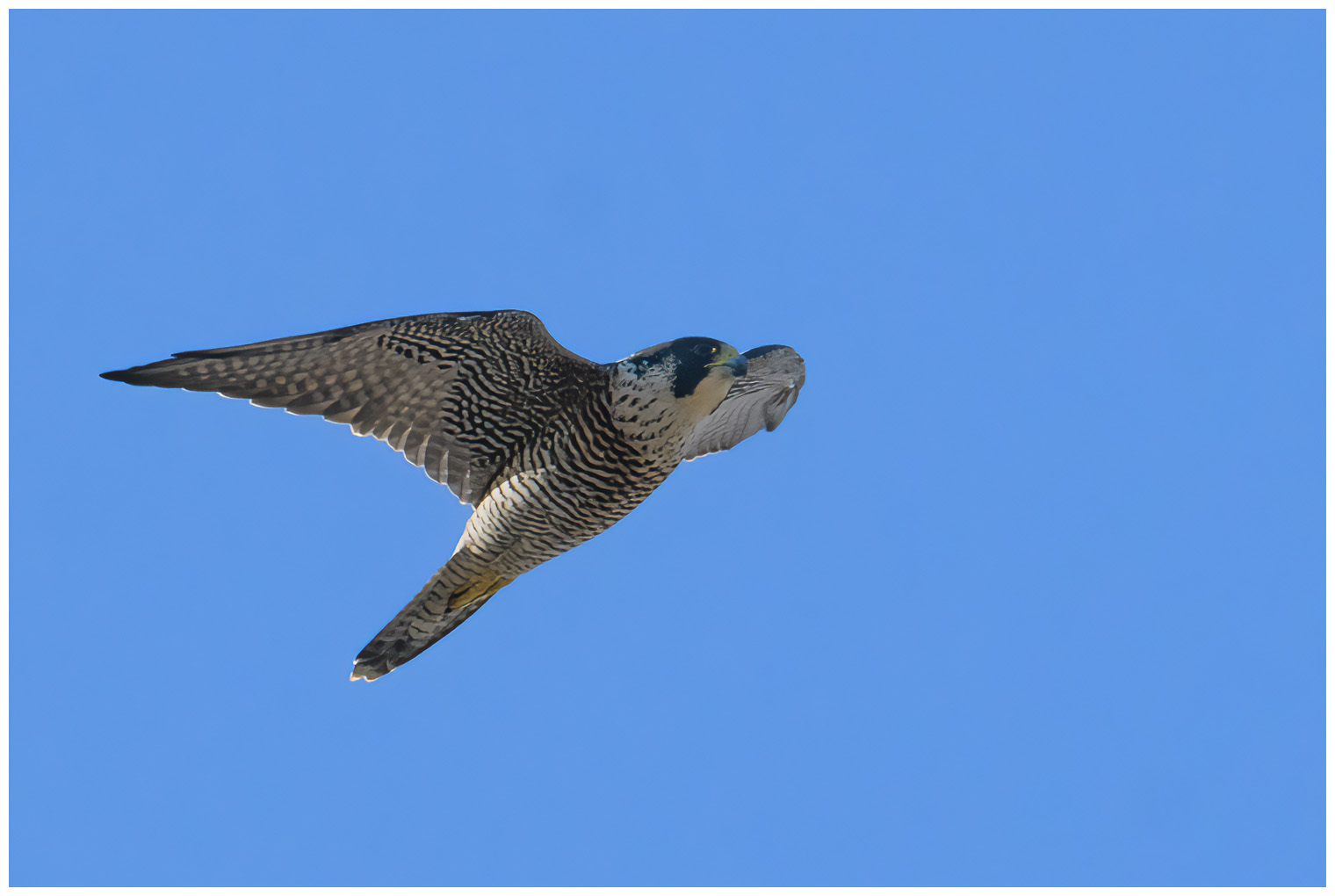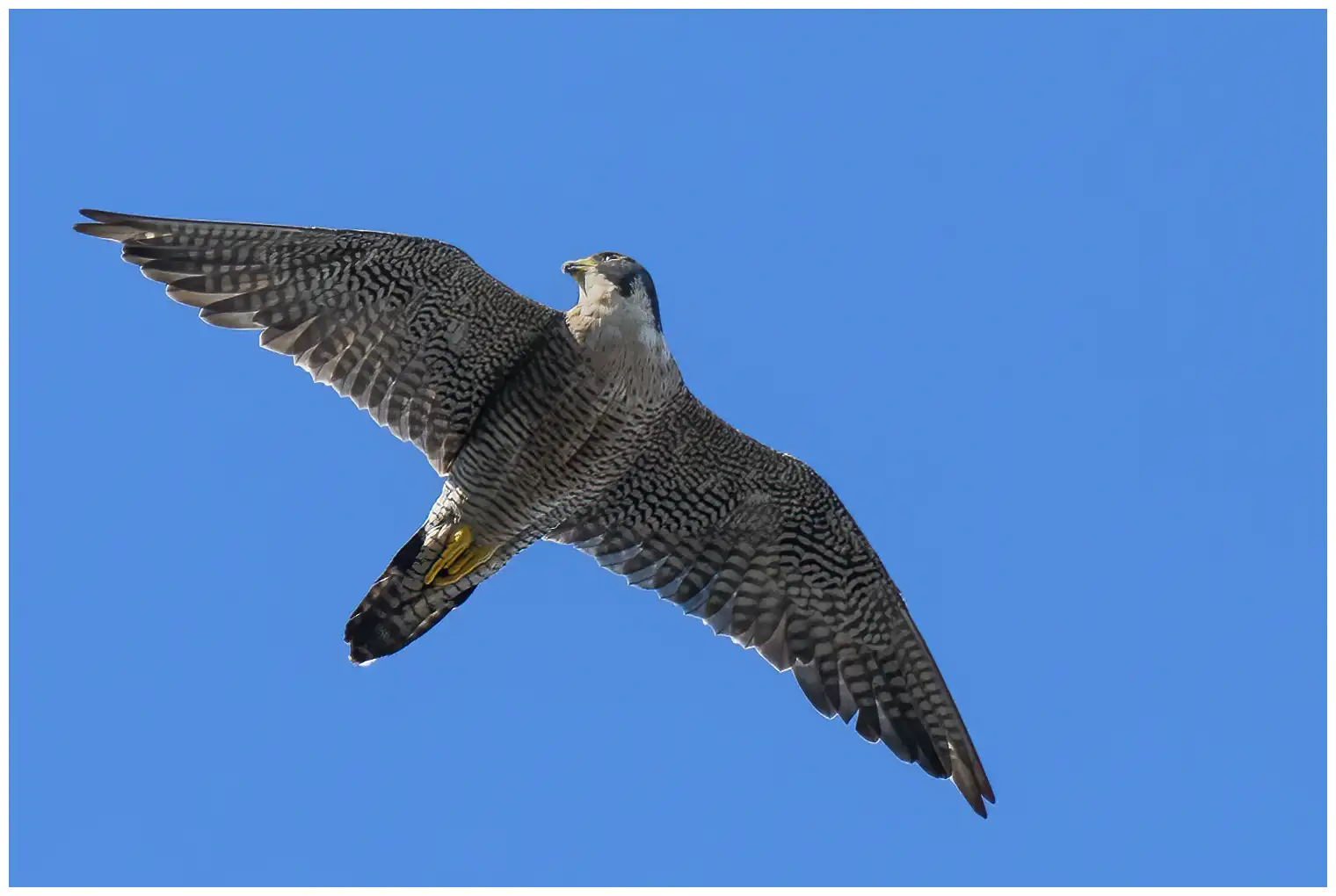 Pilgrimsfalk – Peregrine Falcon även känd som Falco peregrinus, är en imponerande rovfågel med en slank kroppsbyggnad och snabba flygfärdigheter. Storlek på 40-50 cm med en vingspann på cirka 80-110 cm. Denna majestätiska fågel är känd för sin snabbhet och förmåga att dyka ner från höga höjder i jakt på sina byten, vilket gör den till en effektiv jägare av andra fåglar och mindre djur. Pilgrimsfalken har en distinkt fjäderdräkt med grå ovansida och vit undersida, och dess karakteristiska svarta ”moustache”-markeringar vid ögonen ger den ett unikt utseende.
