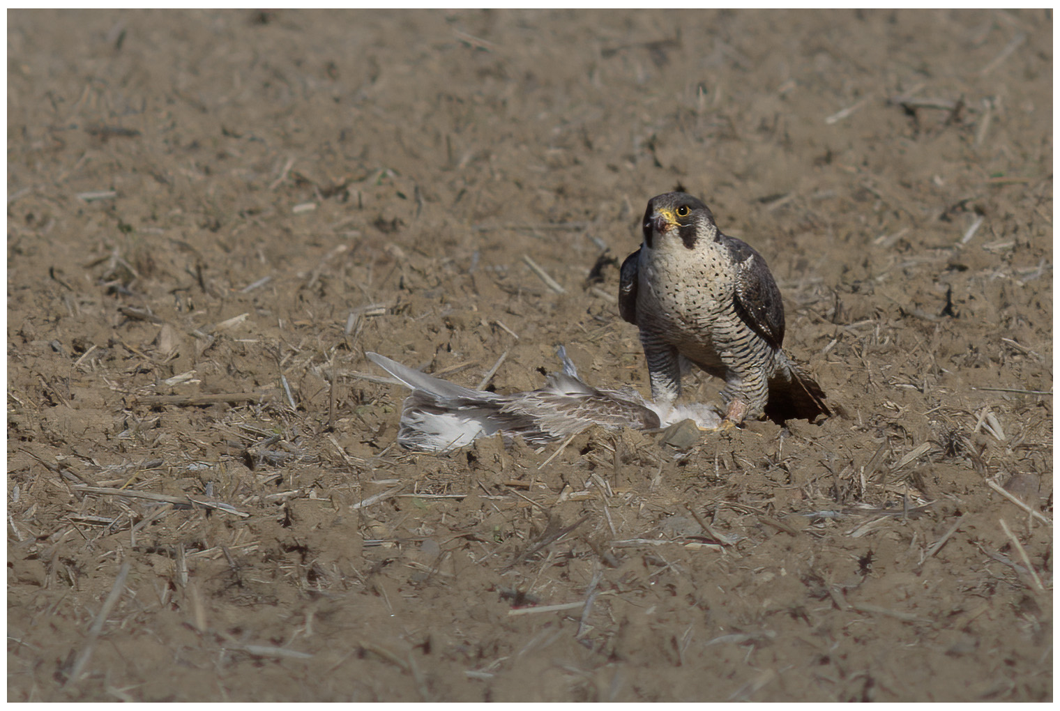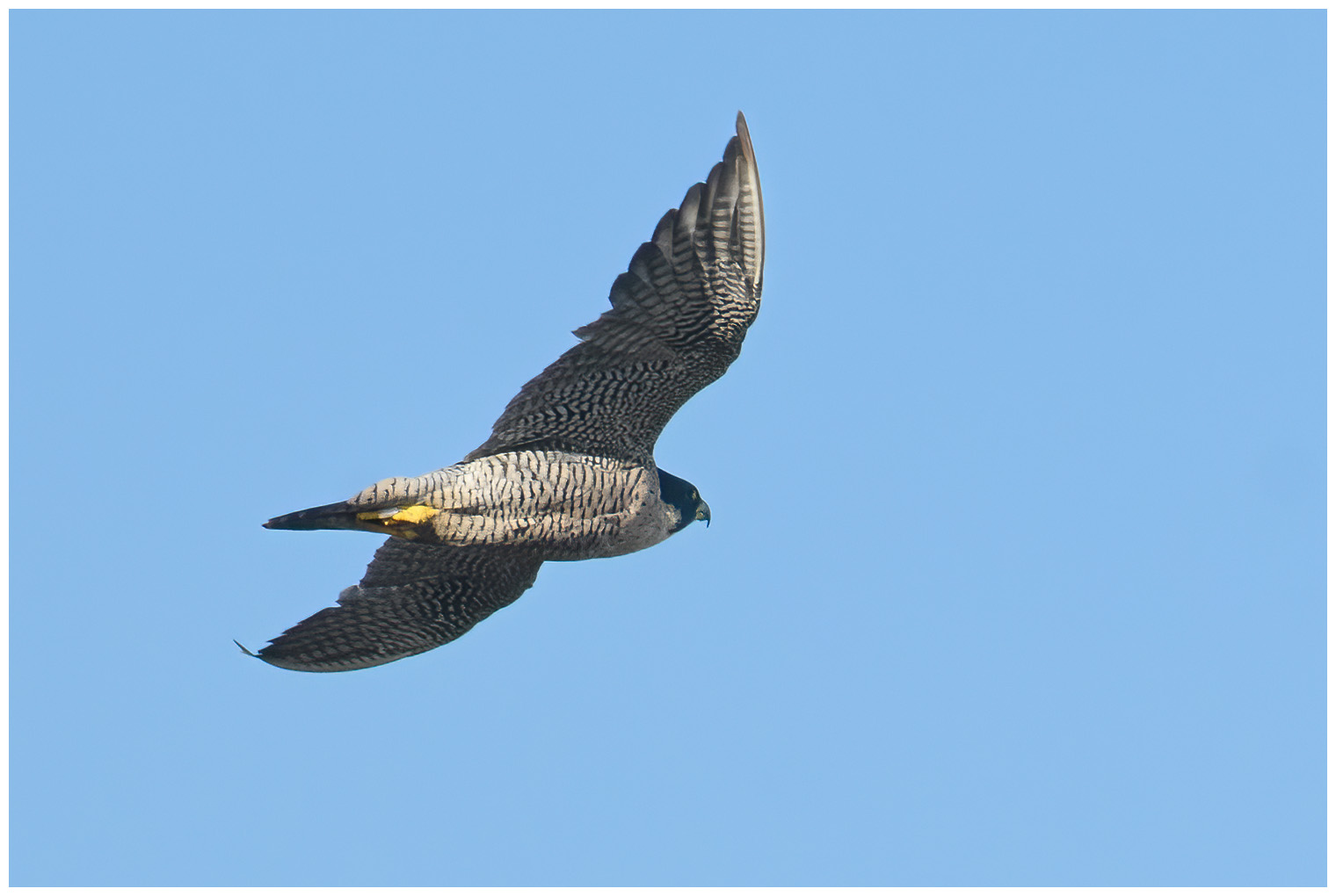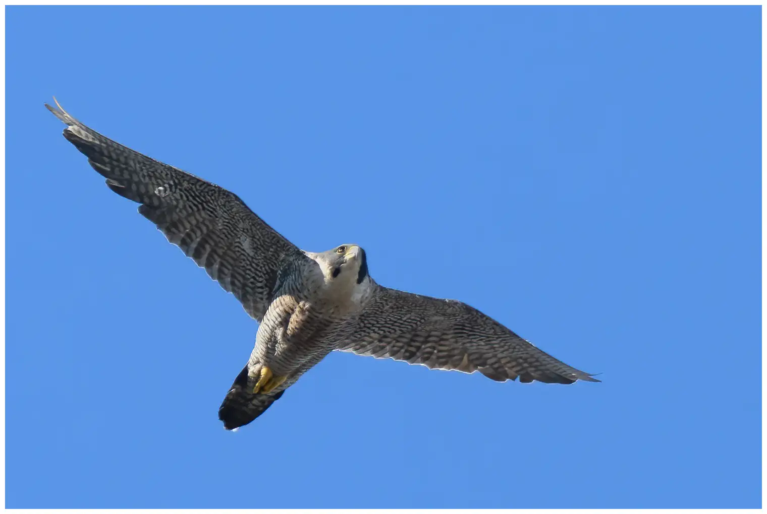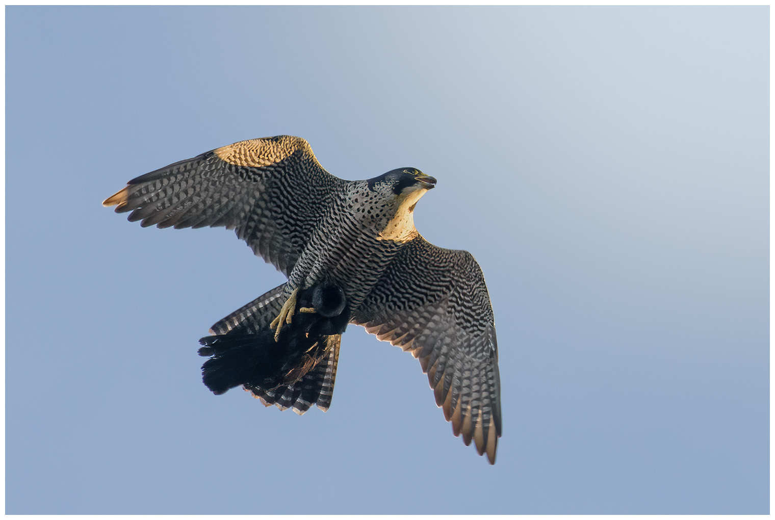 Pilgrimsfalk – Peregrine Falcon även känd som Falco peregrinus, är en imponerande rovfågel med en slank kroppsbyggnad och snabba flygfärdigheter. Storlek på 40-50 cm med en vingspann på cirka 80-110 cm. Denna majestätiska fågel är känd för sin snabbhet och förmåga att dyka ner från höga höjder i jakt på sina byten, vilket gör den till en effektiv jägare av andra fåglar och mindre djur. Pilgrimsfalken har en distinkt fjäderdräkt med grå ovansida och vit undersida, och dess karakteristiska svarta ”moustache”-markeringar vid ögonen ger den ett unikt utseende.