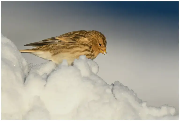 Vinterhämpling – Twite är en liten fågel som tillhör familjen fältsparvar och trivs i de nordliga delarna av Sverige under vintermånaderna. Storlek på cirka 14 cm. Den är känd för sin anpassningsförmåga till kylan och snön och ses ofta leta efter föda under snötäcket. Vinterhämplingen har en karakteristisk fjällig fjäderdräkt som hjälper den att hålla värmen under de stränga vinterförhållandena. Denna fågel är en mästare på att hitta frön och små insekter även när tillgången på föda är knapp under vintern.
